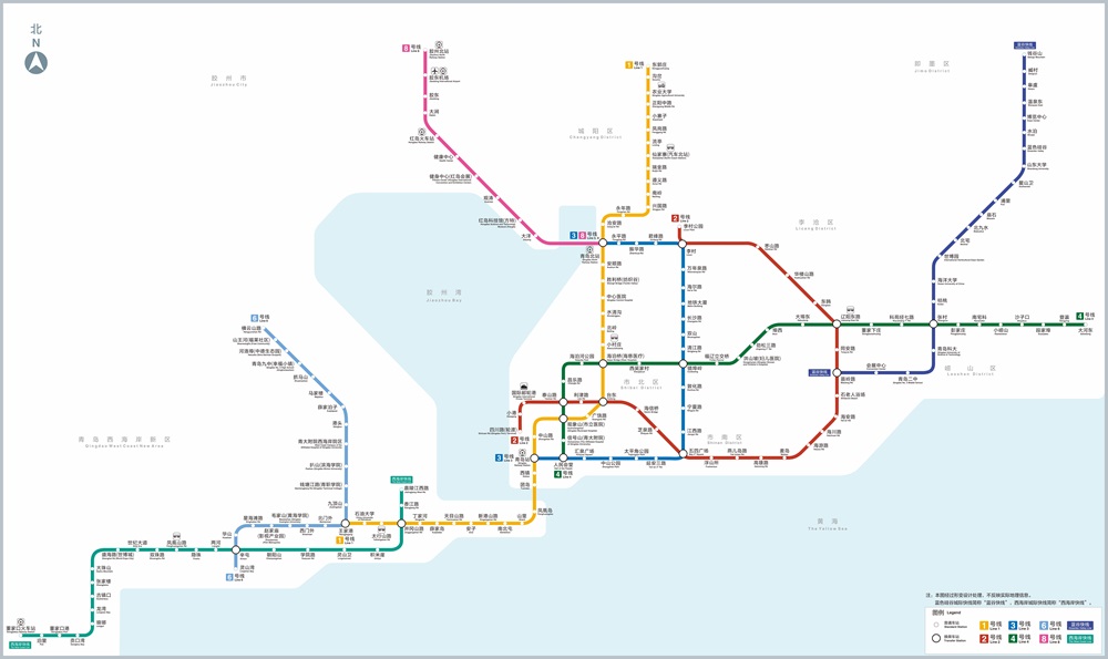 地铁:青岛北站乘坐1号线至井冈山路站,换乘西海岸快线至盛海路B口下车,步行1.9公里,行程约2.2小时,约花费8元